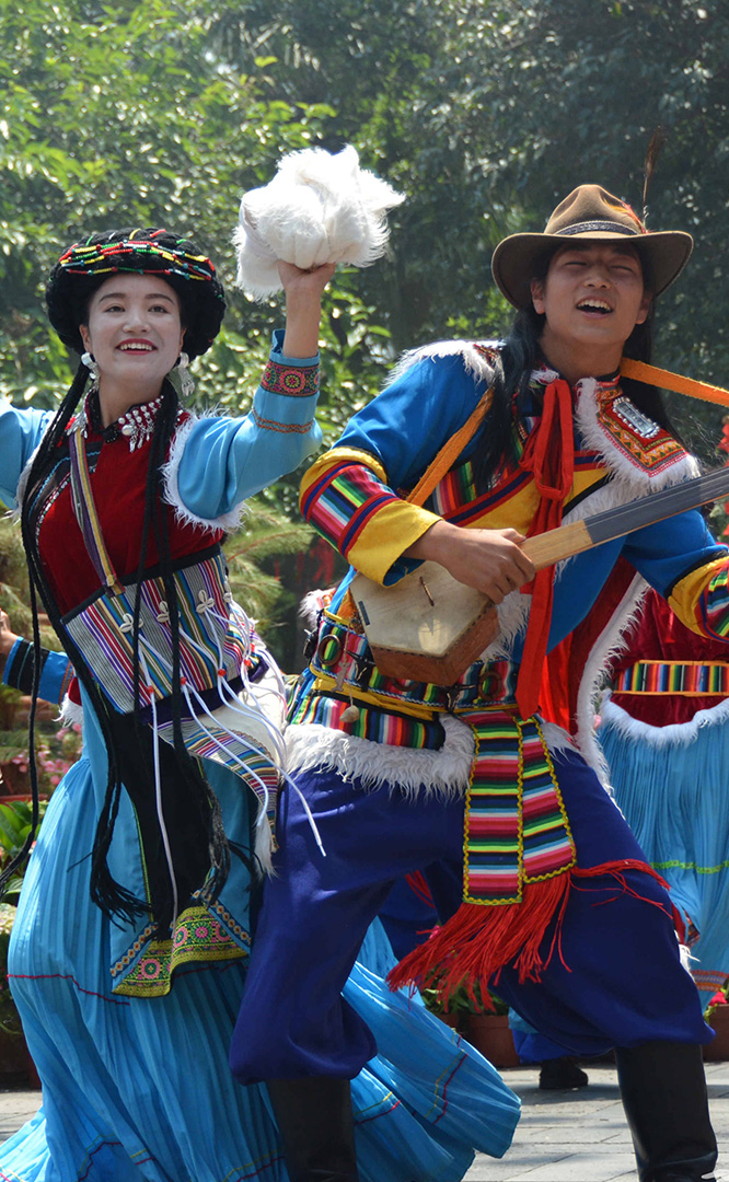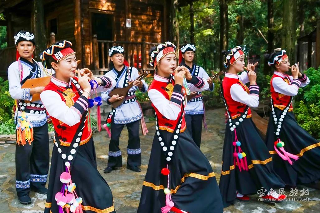 彝族在云南境內約471萬人,是省內人口最多、分布最廣的少數民族,主要聚居在金沙江、元江流域和哀牢山、無量山腹地。彝族是一個能歌善舞的民族,民間打歌、跳樂之風盛行,大三弦、跌腳舞久負盛名。火把節(jié)是彝族最具特色的民族節(jié)日。彝族村占地50余畝,三虎浮雕墻與虎頭內祖師形象表現(xiàn)了彝族虎鷹文化。太陽歷廣場圖騰柱上有太陽、虎、火和八卦圖形象,周圍環(huán)繞著10個朝向不同的月球造型,外圓周有12生肖石雕。依山而建的“...